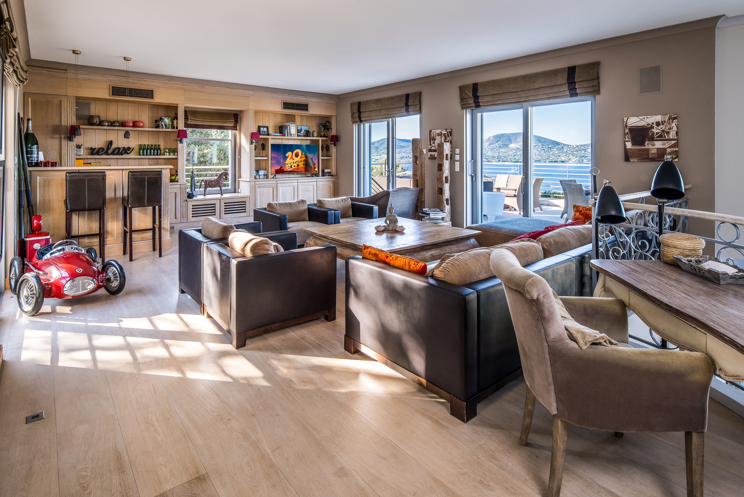 With bar, television with satellite channels, Apple TV and DVD player, music system and a large terrace overlooking the bay